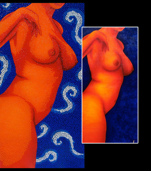 This piece was created by over-painting dots on a completed figurative painting. The subtle tones & textures of the under-painting create interplays of light that change as the viewer moves, and the bright sun and blue of the oceans/sky create visual contrast between the dots and the traditional painting.